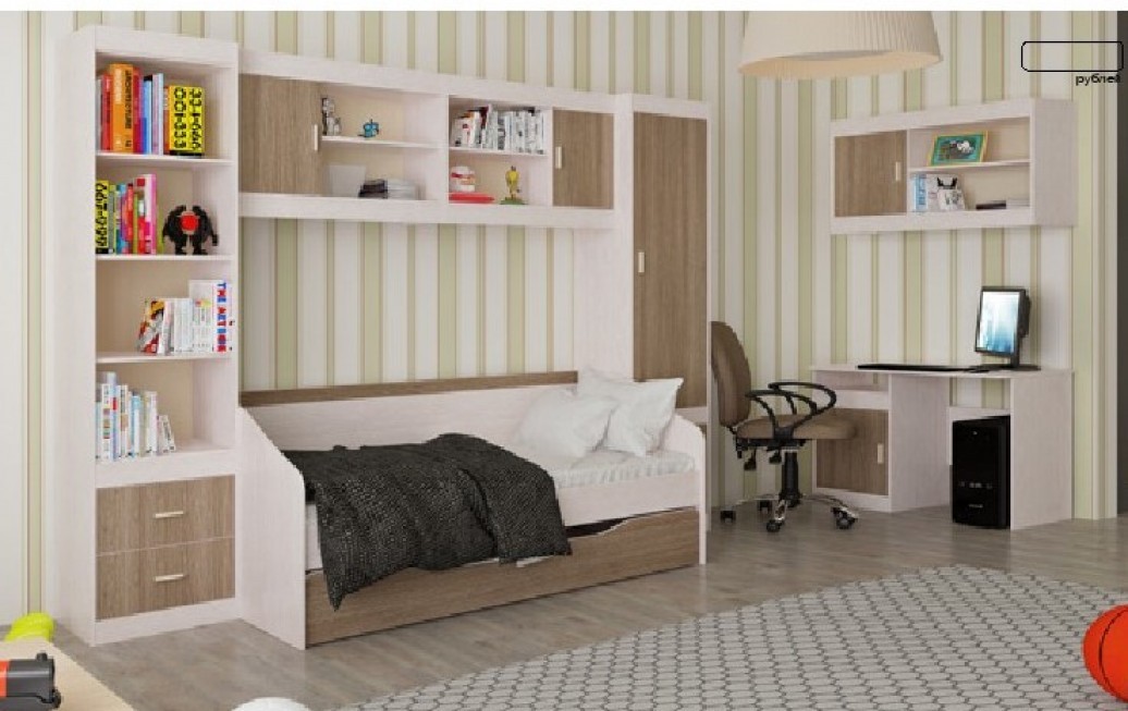 Модульная система детской Пьер- когда взрослые предметы интерьера отлично адаптировались в детской комнате! Вместительный пенал для вещей, пенал с выдвижными ящиками и полками для книг, удобный письменный стол с тумбой, навесную полку и многофункциональную кровать можно разместить по своему усмотрению, создавая свой собственный интерьер. Выкатной (выдвижной) ящик расположенный в нижней части кровати можно использовать как дополнительное спальное место и как место для хранения игрушек и постельных принадлежностей. Все модули выполнены в современной, теплой цветовой гамме которая подойдет девочкам и мальчикам.