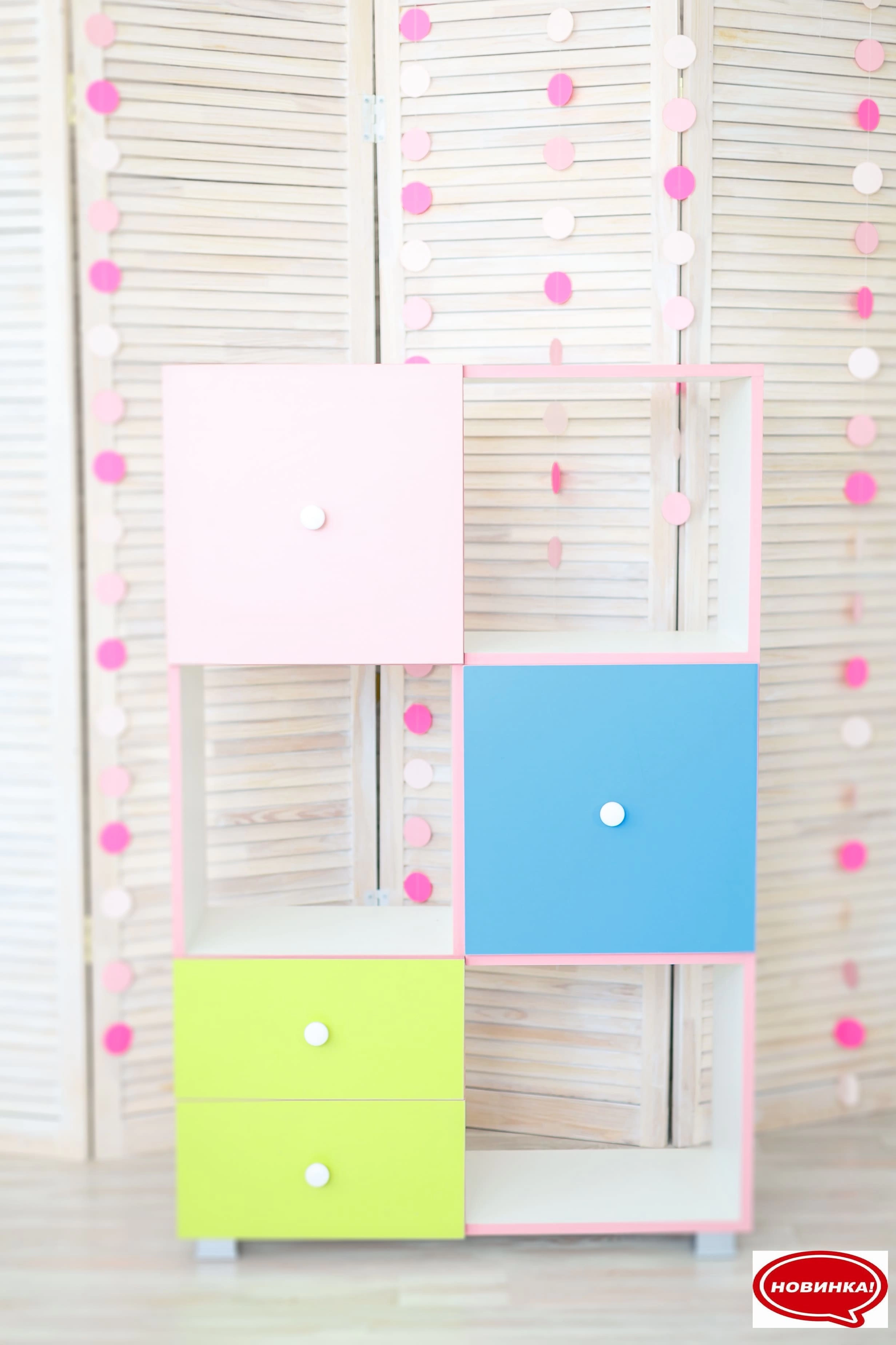 - Имеет два ящика в нижнем левом углу и распашные дверцы по диагонали